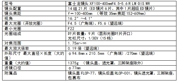 “富士龙镜头 XF100-400mmF4.5-5.6 R LM OIS WR”是一款等效35mm焦距达152-609mm的超望远变焦镜头。包括5片ED镜片和1片超级ED镜片,14组21片的高性能光学设计,彻底降低望远镜头容易产生的色差,实现高画质。此外,AF采用高速双重线性马达,可拍摄飞机、摩托车等高速移动的物体,还配备5.0档※1光学防抖功能,且重量小于1.4kg,使手持超望远拍摄更加轻松方便。此外,该款镜头凭借其防尘、防滴、-10℃的耐低温结构,能适应各种室外天气,前置镜头更是采用防水防污的氟涂层,进一步加强了镜头的韧性。