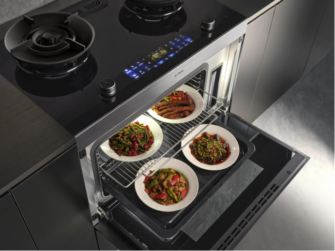 传统厨电“各自为战”,让多菜同烹效率不佳。方太通过重构厨电之间的协同逻辑,支持蒸烤同烹、双温同烤,真正实现一日三餐一锅出。方太集成烹饪中心蒸烤一体机支持温湿双控,高精度湿度传感器拥有精准感知能力、温湿动态精控算法,让腔内温度更加精准;双擎热风速控系统,让食物受热更均匀,烘烤效果更出色。此外,方太集成烹饪中心采用了FOTILE FIKS 智能生活家系统,通过全新的多触点交互式智能操控系统,实现了人、厨房设备、厨房场景的有机互联,支持烟灶联动、烟烹联动,更加智慧、高效。