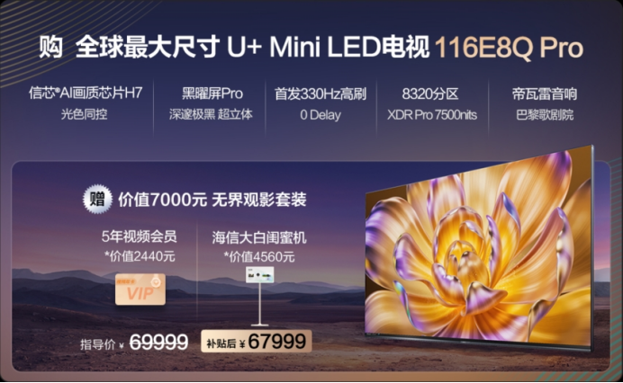 五一假期期间,海信116E8Q Pro国补后到手67999元;在国补之外还可享价值7000元的大白闺蜜机+5年视频会员。