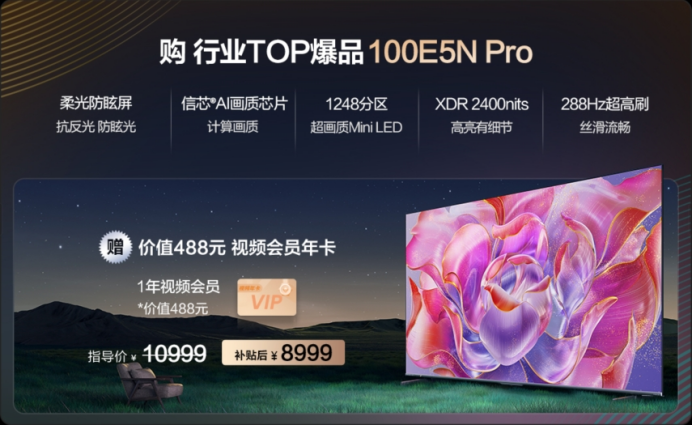 五一假期期间,海信100E5N Pro国补后到手8999元,加赠价值488元的一年视频会员。
