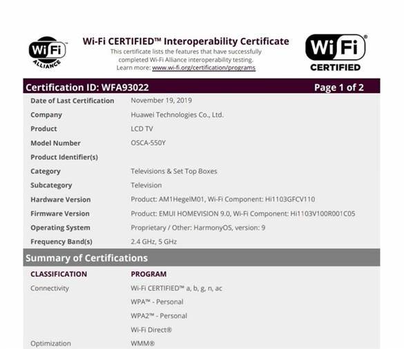 华为再推新款智慧屏?已通过Wi-Fi联盟认证