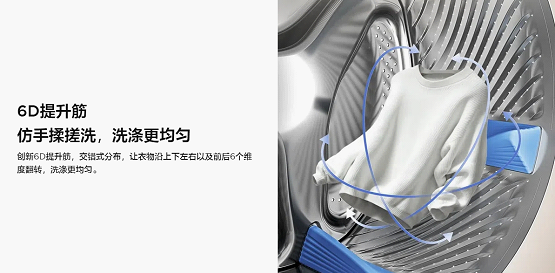 提升筋在滚筒洗衣机的工作流程中同样有重要作用,TCL超级筒洗衣机T7H Pro内筒搭载6D提升筋,采用一长一短的交错布置与鱼鳍状仿生形态,使得衣物能够更高频次翻转交错,更容易解开缠绕减少清洁死角,起到如手动揉搓版的仿生效果。
