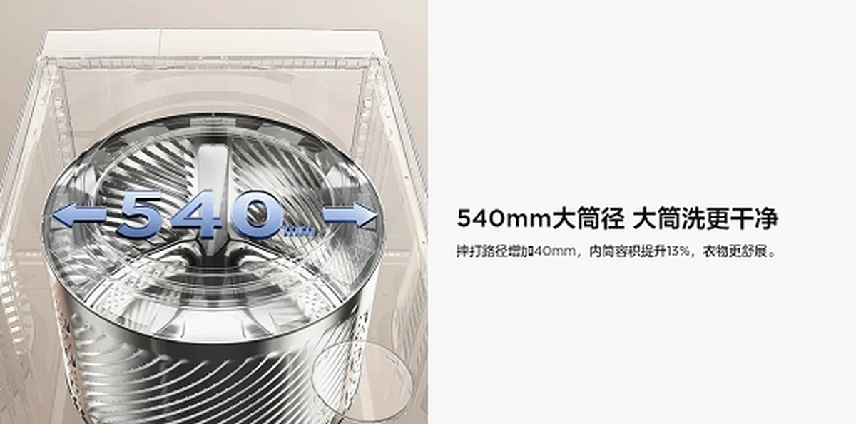 高洗净比的秘诀来自“超级筒”从多方面进行的洗衣能力优化。它采用540mm的超大筒径,相比普通滚筒洗衣机500mm直径内筒,增加了40mm,大筒径使得衣物在筒中翻滚、提升空间更大,摔落的运动行程更长,更容易使衣物上的脏污在冲击、摔打的仿生洗衣原理下高效分离,进而提升洗衣能力。