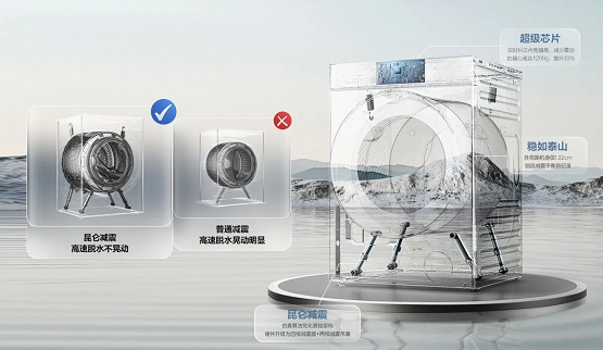 洗衣机内部的减震降噪结构同样与用户的日常体验息息相关,在内筒高速旋转、脱水工作时,也需要降低工作时产生的噪音与振动,避免打扰家人与邻居。TCL超级筒洗衣机T7H Pro搭载昆仑减震结构,配备4个减震器、2个减震吊簧,以及对内筒进行实时偏心检测的芯片,持续回收洗衣机运转时产生的能量并减少工作噪音。