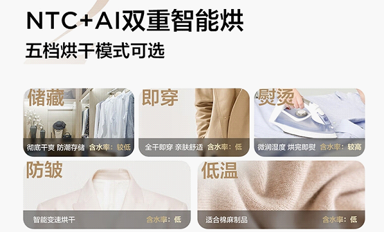 TCL超级筒洗衣机T7H Pro洗烘版在烘干能力上同样配置拉满,内置NTC传感器结合AI智能算法提供了五档烘干模式,可根据烘干衣物重量、材质与用户对干燥程度的需求,精准控制烘干温度与时间,实现衣干即停不伤衣,并获得了CHCT低温烘干护衣认证。