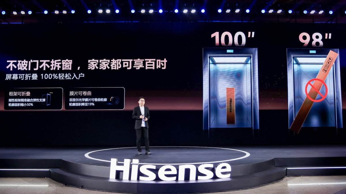 海信激光电视星光S1的百吋大屏采纳了与去年产品L5K相同的可折叠技术,使得超百英寸的电视也能采用“分体式轻量化入户”方案。其柔性屏幕能够卷曲,卷曲后的大小与瑜伽垫相当,框架同样支持折叠,因此入户入梯过程毫无压力,这一特点在同尺寸液晶电视中尤为突出。