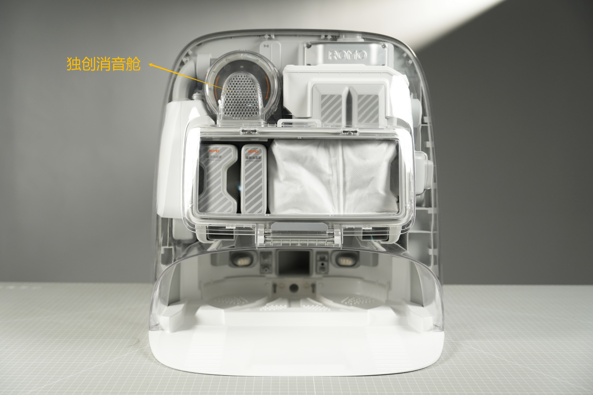 大疆ROMO P扫地机器人延续了大疆一贯的极简主义与实用哲学,灰白配色简洁大方,全透明的机身设计更是新颖大胆,内部结构清晰可见,为家居空间增添一抹科技美感。基站正面,可以清晰看到内部集成的电控系统、独创消音舱、两个清洁液仓和尘袋等核心组件。