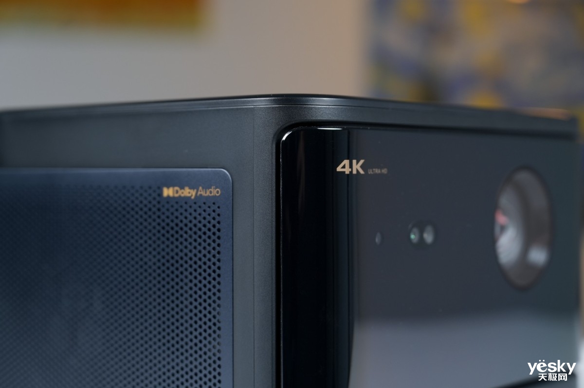 投影镜头与ToF摄像头组成了机身正面的主要元素,其中右侧投影镜头用于输出投影画面;左侧为新一代全知AI视觉系统2.0,以万点3D ToF视觉感知覆盖全画面,实现更快更准的无感对焦、无感梯形校正、避障、感应护眼等功能。同时,机身正面左上角采用新一代特有烫金4K ULTRA HD标识,凸显当贝X5 Pro的高端属性。