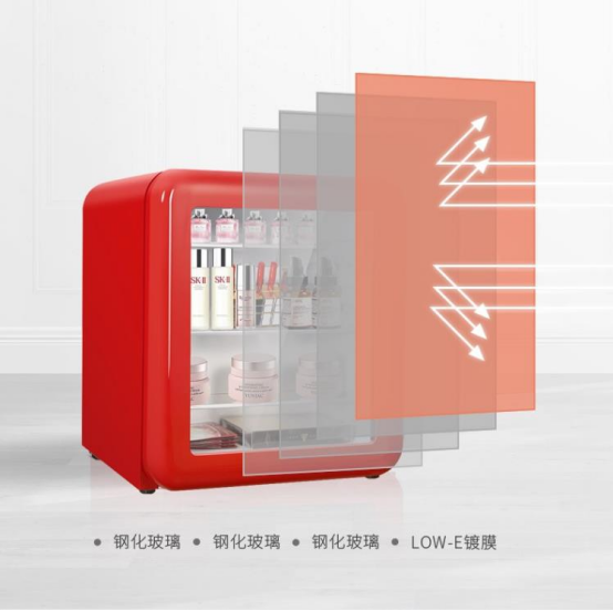 这款哈士奇美妆化妆品冰箱SC-46RGE的“颜值”也非常吸睛。它采用了复古设计,正面为三层钢化玻璃加专业LOW-E镀膜组成的透视窗,各种化妆品不仅清晰可见,日常用来拍照分享也非常好看。而且透视窗可有效抵御光线干扰,避光避热,延长化妆品使用寿命。冰箱还搭载了一个白光小夜灯,为用户提供了一个很好的夜间化妆条件,哪怕晚上,也可以清晰看清楚每一个化妆品,防止拿错。