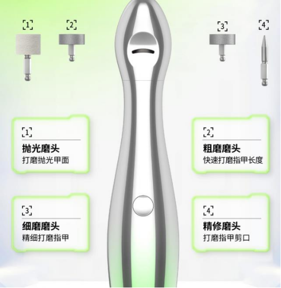 品颜玩甲师磨甲器采用了耐用不伤甲的金砂磨头,并拥有4种磨甲方式,抛光磨头能够打磨抛光甲面、粗磨磨头用于打磨指甲长度、细磨磨头用作精细打磨指甲、精修磨头则可以打磨指甲剪口,满足用户多种磨甲需求。