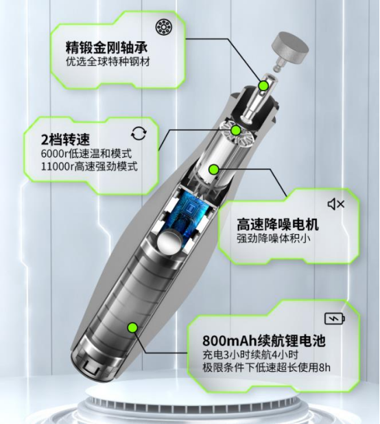 此外,品颜玩甲师磨甲器还采用贴合指尖角度的仿生设计,能够有效减少90%的磨甲尘屑飞扬。其中内置的高速降噪电机配合自研的智能芯片,在带来6000r的低速温和模式和11000r的高速强劲模式的同时,精自动启动多重电路保护,保证高效打磨,不震手也不伤甲。