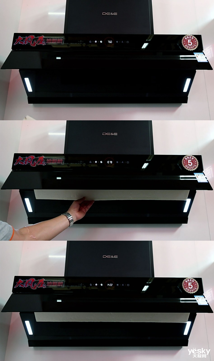 现场工作人员为我们进行演示,直观地展示了大风压的威力。在演示模式下,操控板中央的红圈会显示转数。工作人员把一块板放到油网前面,强大的吸力一下就把板子吸住了,掉不下来。同时,烟机侦测到风道不畅,电机便加大动力输出,增大了转数,红圈内的数字一下由760迅速飙升到1078,乃至1422。说明随着风道阻力的增大,转速也越大,风压也随之增大。