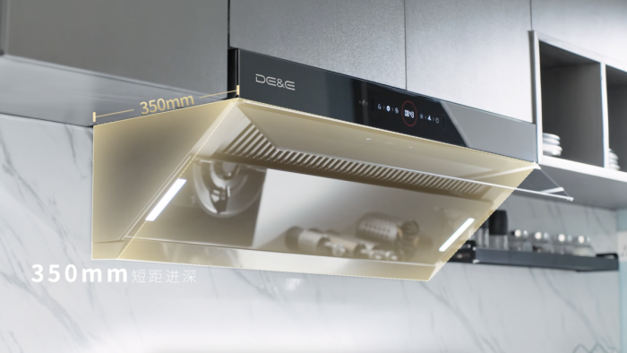 从侧面看,可以看出,德意A6Pro烟机的占用空间要明显地小,让出了不小空间。