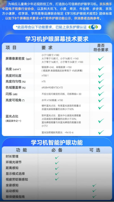 青少年眼部健康问题不容忽视,早在2023年11月,京东就联合中国电子视像行业协会,以及科大讯飞、学而思、京东方、作业帮、步步高、希沃、优学派、小度等品牌,共同发布了国内首个《学习机护眼技术规范》团体标准。这一标准针对学习机的屏幕像素密度、屏幕亮度、亮度对比度、色域覆盖率、屏幕闪烁等级、亮度可视角度以及硬件、软件的蓝光占比等方面提出了明确的要求,并对学习机智能护眼功能方面进行了强制约束,旨在为消费者提供真正护眼的学习机产品。