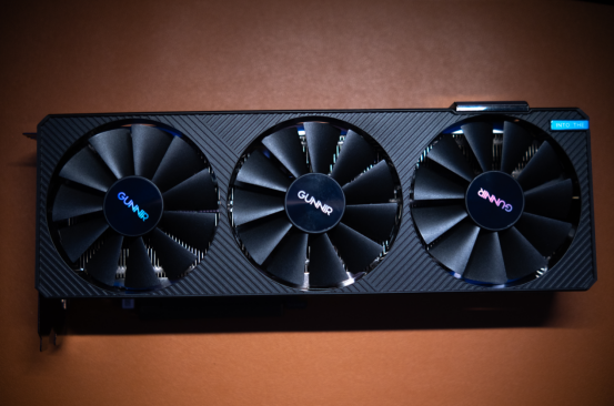 蓝戟A770 Photon 16G OC的背面采用了金属材质,防护性更好,镭射光粒子束和机甲战损纹理的设计是对未来科幻美学的想象力体现,视觉上恰到好处,有很强的的质感。CPU部分则做了镂空设计,有利于提升显卡散热效果,“PHOTON”的蓝色字样彰显了显卡的身份标识。显卡的设计总体给人一种简约纯粹的感觉,也有科幻能量的特色,很戳游戏玩家的审美。