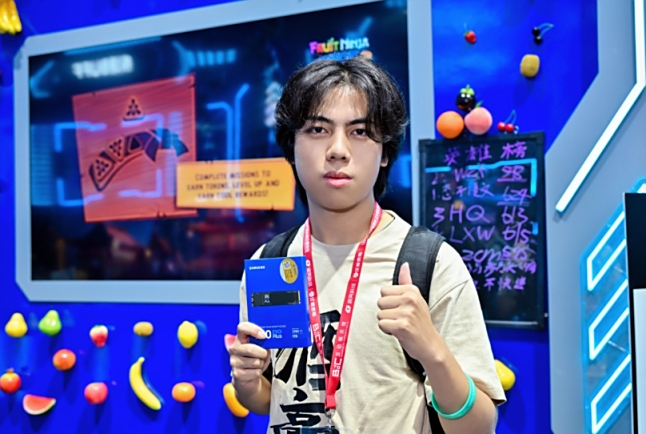 "迅捷BUFF"体验区配备搭载9100 PRO固态硬盘的高性能电竞主机,运行《刺客信条:影》等热门游戏,玩家可直观体验PCIe5.0存储带来的极速加载和流畅画面。该区域还设置了《水果忍者》体感游戏挑战赛,参与者有机会登上每日英雄榜并赢取三星990 EVO Plus固态硬盘1TB大奖。