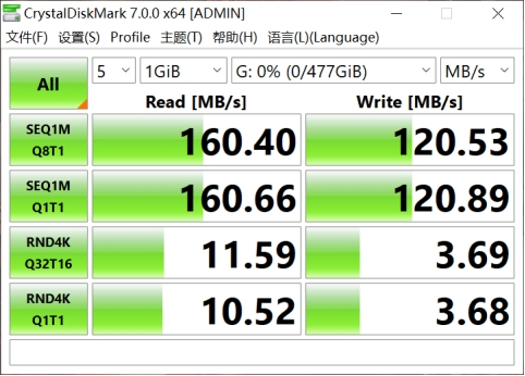 首先我们选用的测试软件是CrystalDiskMark,这是一款比较主流的存储设备性能测试工具,操作简单快捷,并不需要复杂的设置,并且测试结果也是较为准确的。从测试结果可以看到,其中读速最高达到了160.66MB/S,写速在120.89MB/S,这和官方公布的速度数据是完全一致的。