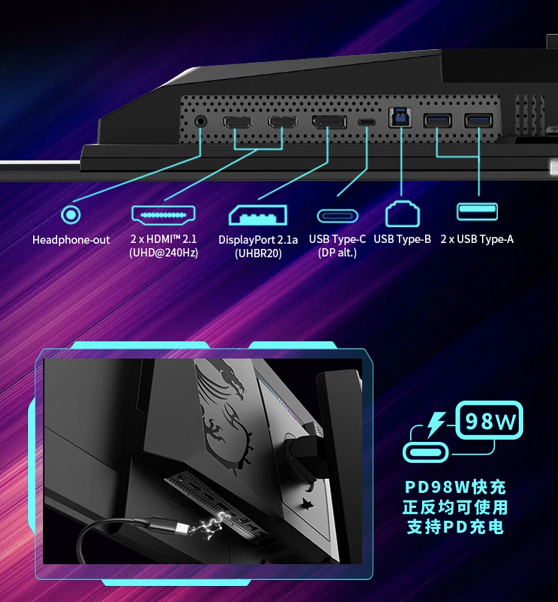 接口方面这台高端显示器也配置齐全,不仅采用方便的内置电源设计,在高规格接口方面更是配备了2个HDMI 2.1与一个DP 2.1a(UHBR20)的组合,前者可通过DSC(显示流压缩)支持4K 240Hz,而后者最大80Gbps的带宽性能则支持顶格画面的无损传输。此外在包装内也贴心地配了一根支持UHBR20的合规DP线材。