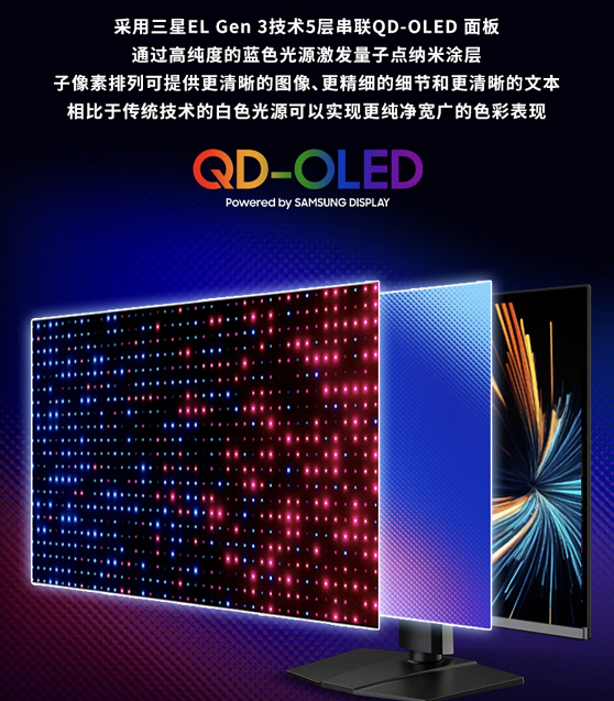 商品详情页显示它采用三星EL Gen 3技术的5层串联QD-OLED面板,实现30%能效改进,拥有更低功耗的同时保持了峰值1000nits的HDR亮度表现。不过在HDR性能认证方面依然处于DisplayHDR True Black 400水平,也许意味着它的全屏亮度并没有太大提升。