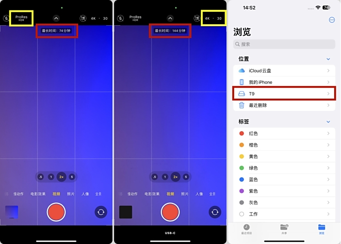 以1TB版本的iPhone 15 Pro Max为例,拍摄的4K 30fps ProRes视频显示的最高时长是74分钟,而在接入1TB的三星T9之后,这个时间变为了144分钟,此时拍摄的ProRes格式视频还能够解锁到4K 60fps。