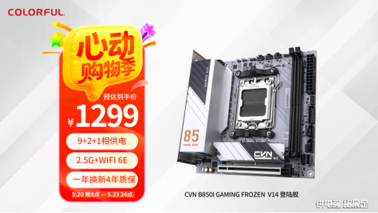 CVN B850I登陆舰延续了上一代家族式小巧设计,在VRM散热装甲上铭板上设计有“舷号85”,同时采用银白配色,突出了军事风格的硬朗气质。采用9+2+1相60A DrMOS供电设计,轻松应该AMD 锐龙 7 9800X3D热门游戏处理器,双内存槽可支持高达8000MHz的双通内存;内置2个M.2固态硬盘接口和2个SATA接口,为以后升级留下空间;自带一体式IO面板,拥有8个USB接口其中一个10G的USB-C接口,还配备了主流的2.5G+WiFi 6E高速网络组合。目前是市面上少有的银白色ITX锐龙主板,非常适合搭配锐龙 7 9700X/9800X3D处理器打造小巧游戏小钢炮,目前该主板在七彩虹京东自营旗舰店活动价格为1299元,还有随机满减券,最低到手价仅1249元。