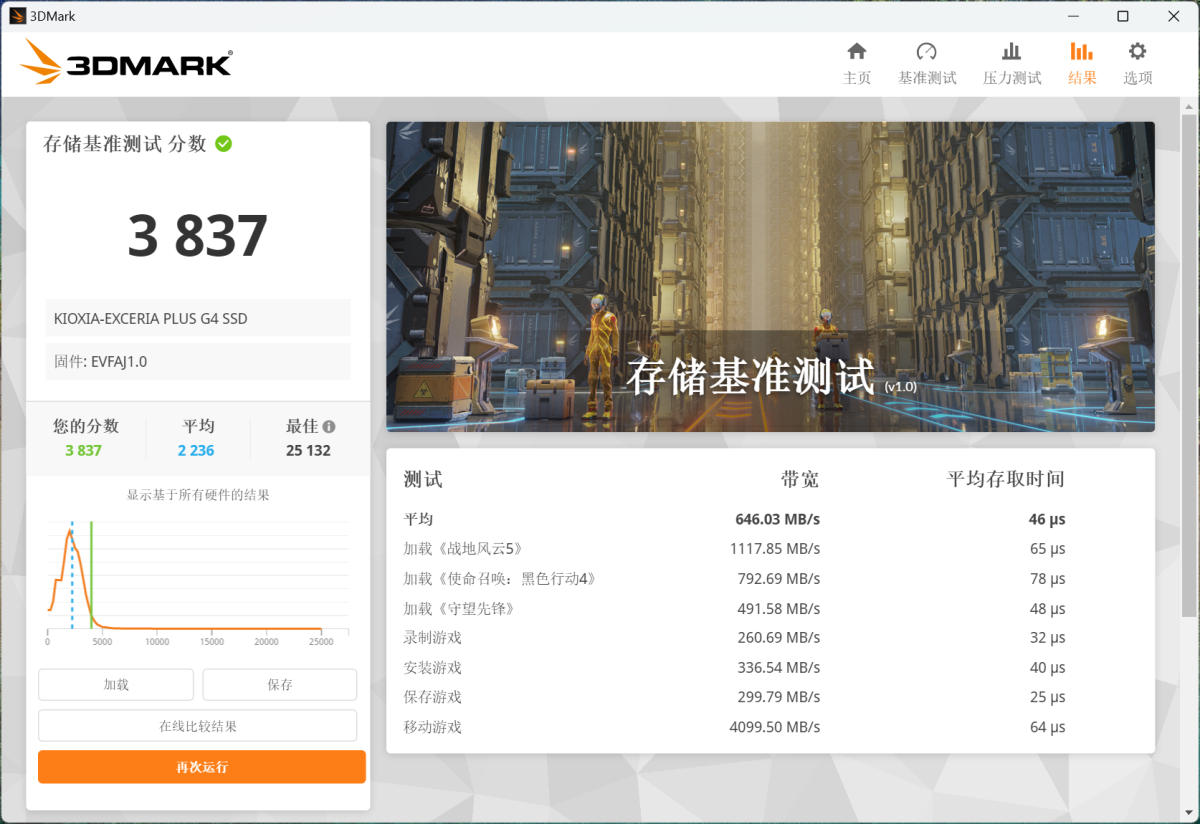 近期我们新增了3DMark软件内的存储基准测试项目,通过游戏加载、录制、安装、保存、移动多个项目,模拟硬盘在实际游戏负载中的表现,并形成量化可参考的结果。铠侠VD10在这一测试中获得3837分。