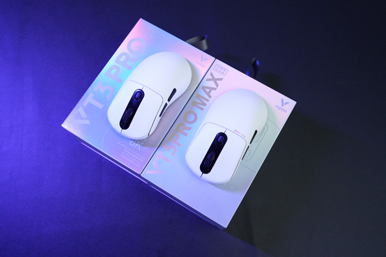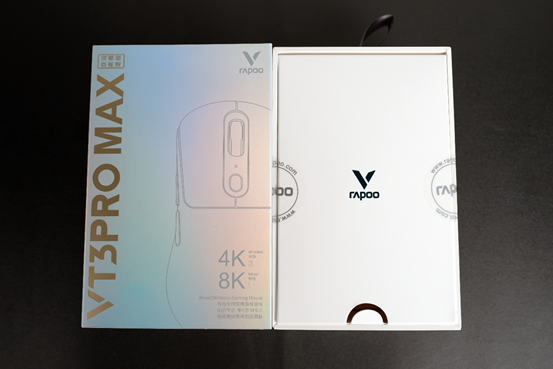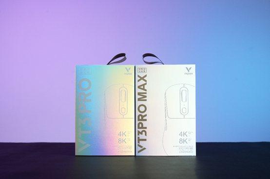 雷柏VT3双高速系列鼠标有两款产品,分别是雷柏VT3PRO和雷柏VT3PRO MAX,产品外包装均使用彩虹纹设计,在光线下反射出彩虹色。VT3PRO MAX的反射没有VT3PRO那么夸张,更具高级质感一些。