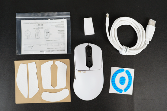 抽拉出装有产品本体的盒子并打开,内里设计了一块海绵来固定鼠标,除了鼠标本体,配件有说明书、一条USB编织数据线、一个Type-C to Type-A延长转换器、一套备用脚贴、一套防滑贴。