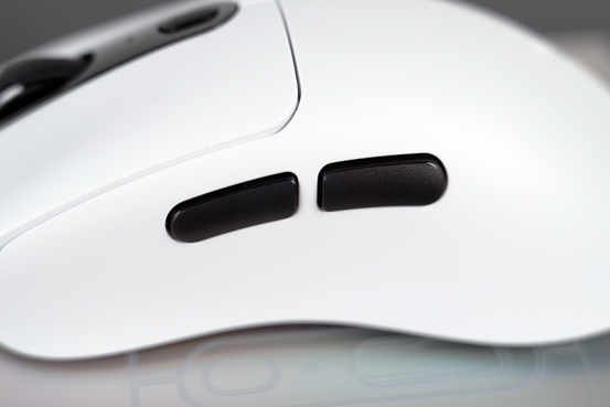 鼠标的材质介于类肤和磨砂之间,顺滑的同时又轻微带一些磨砂的质感,侧键和DPI切换键则是实打实的磨砂质感。