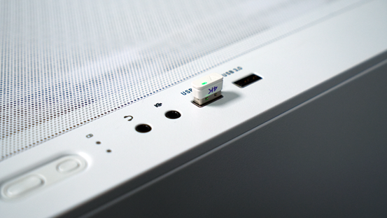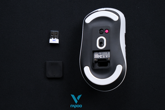 鼠标底部是则是通体黑色搭配白色的特氟龙脚贴,开关键旁边还有一个粉红色的DIY键,设计在底部有效防止误触,玩家可以在官方驱动中自定义这个按键的功能。打开接收器仓盖板,里面是一个4K nano接收器,通过这个小小的接收器就可以实现原生4K无线传输。