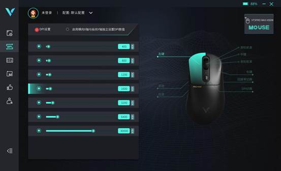 此外鼠标还支持X/Y轴DPI独立调节,玩FPS游戏的朋友就可以利用这项功能将Y轴灵敏度调低,实现稳定的压枪,而横移瞄准的操作则不受影响。LOD 0.7-1.7mm 11档静默高度可调,LOD主要的作用就是减少将鼠标抬起移动而失去捕捉的情况,玩游戏时激烈的操作会令鼠标一直保持在移动的状态,大范围的移动有可能会使普通鼠标出现“丢帧”,调整更高的LOD则可以避免这个情况,即便在移动过程中鼠标稍稍离开鼠标垫,强大的光学引擎还是能够精准捕捉移动,从而保证我们在游戏中的稳定操作。VT3PRO配置原相3398定制光学引擎(3395高定版),拥有650IPS追踪速度、50G加速度,LOD 1-2mm 11档静默高度可调,原生50-30000DPI,支持以50为单位逐级调节,同样支持X/Y轴DPI独立调节。