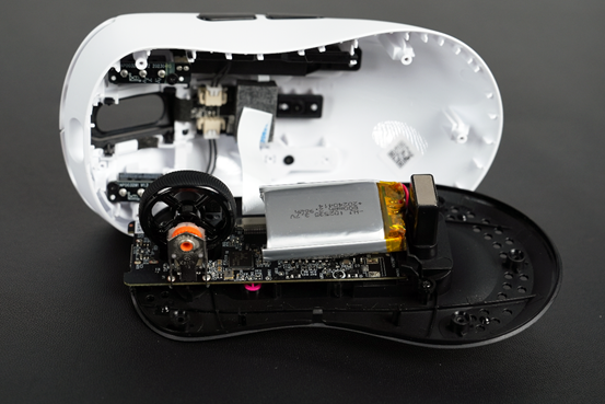 接下来我们对VT3PRO MAX鼠标进行拆解,撕开鼠标底部的脚贴,拧开螺丝,即可将鼠标拆开,鼠标的左右键、DPI调节键和侧键通过排线与PCB底板连接,800mAh大电池被泡棉胶固定在PCB底板上。