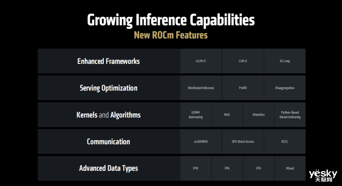 面对持续增加的推理需求,ROCm 7带来了一系列全新特性,包括增强的框架、Serving优化、内核与算法改进、高级数据类型(FP8/FP6/FP4/混合)、优化GPU利用率和数据传输的通信堆栈等,由此实现了推理性能的提升。