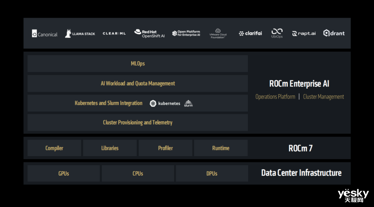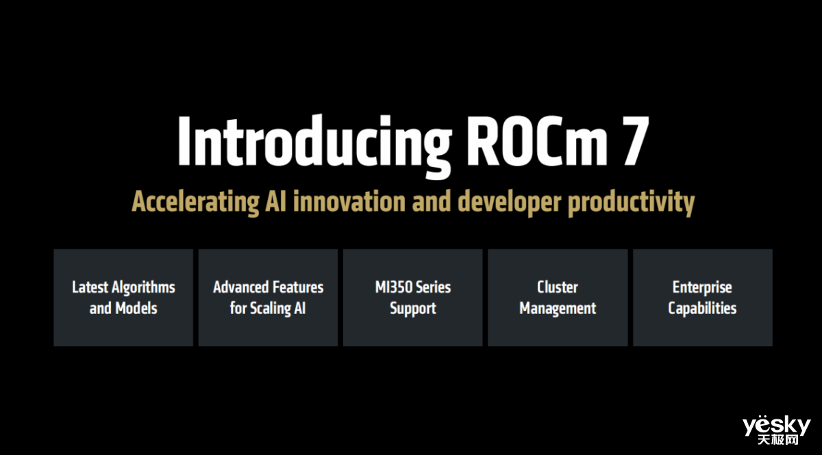 先来看ROCm 7,围绕最新的模型与算法支持、最新的AI特性、MI350系列等新硬件支持、集群管理与企业级特性、提供对AMD Radeon和Windows更广泛支持等方面带来提升,以加速AI创新和提升开发者使用效率。AMD提到,ROCm 7及其新特性将于2025年第三季度全面上线。