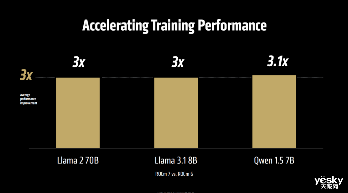 在Llama 2 70B、Llama 3.1 8B、Qwen 1.5 7B测试中,ROCm 7的训练性能相比ROCm 6平均提升达到3倍。