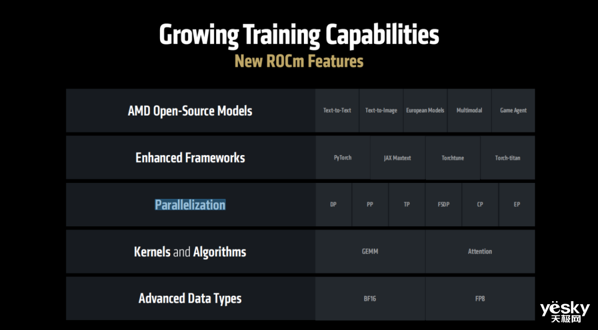 训练方面,ROCm 7同样提供多个新特性,包括支持多个AMD开源模型、增强的AI框架、提升的内核与算法、支持BF16/FB8数据类型等等。