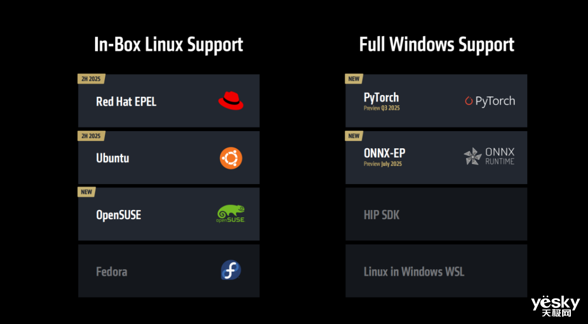 除此之外,ROCm 7进一步优化了在AMD Radeon、Windows上的应用体验,在Windows平台上新增支持PyTorch、ONNX-EP两大框架。此外,ROCm 7还新增原生支持Red Hat EPEL、Ubuntu、OpenSUSE等更多的Linux系统发行版,进一步拓展使用场景,让开发者可以更好地利用现有终端设备进行AI开发,例如Ryzen笔记本或工作站等产品,也让ROCm的准入门槛更低,就像AMD所言,让“ROCm无处不在,人人适用”。