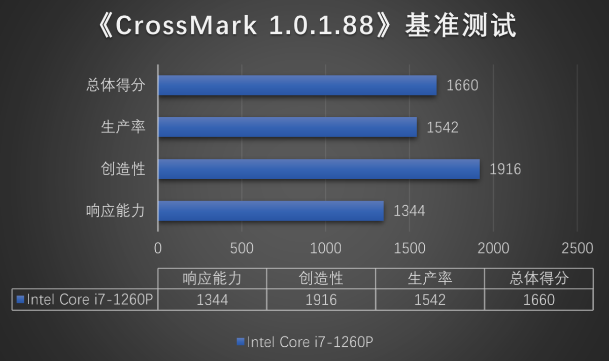 通过CrossMark进行测试,我们看到,搭载英特尔i7-1260P处理器的Lenovo Thinkpad X1 G10总得分1660、生产率得分1542、创造性得分1916、响应能力得分1344。
