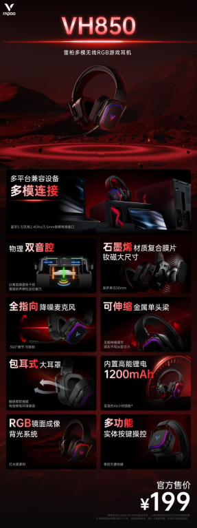 雷柏无线游戏全家桶,包含了你猛攻所需要的关键外设,其中雷柏VH850 多模无线RGB游戏耳机通过物理双音腔的设计,分离音频避免干扰,增强听声辩位的能力,同时搭载50mm超大发声单元,采用石墨烯材质复合膜片、大尺寸钕磁。让敌人和鼠鼠的动作无所遁形。