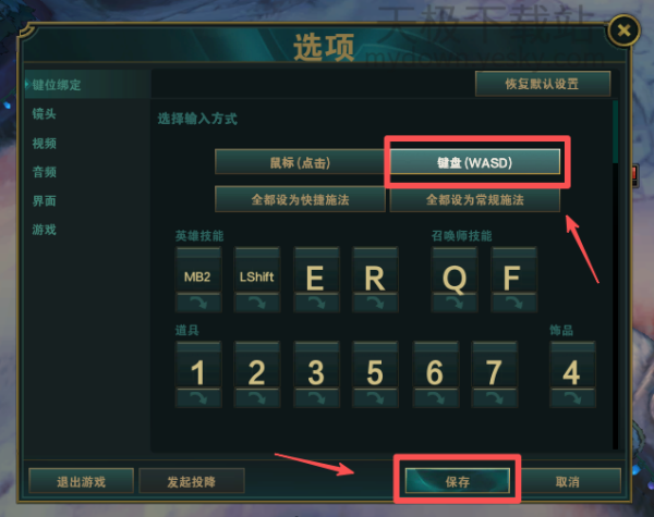 1.下载并打开最新版本的英雄联盟,进入游戏,点击【ESC】调出设置面板,在基础设置中,点击右侧【键盘(WASD)】,然后可以看到所有技能的改键情况,原先的Q技能和W技能改成了“鼠标右键”和“键盘左shift”,召唤师技能改成了“Q”和“F”键位,攻击指令改成了“鼠标左键”,确认所有键位后,点击下方保存。