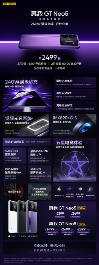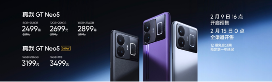 真我GT Neo5将于2月15日0点在全渠道正式开售,起售价仅2499元,最高16GB+1TB的版本,首销价3499元。