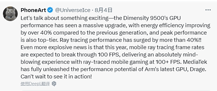 【雷竞技须安全稳定 手机频道】8月5日消息,知名科技博主@UniverseIce (冰宇宙)在X上透露,联发科即将发布的天玑9500的GPU有了大幅提升。