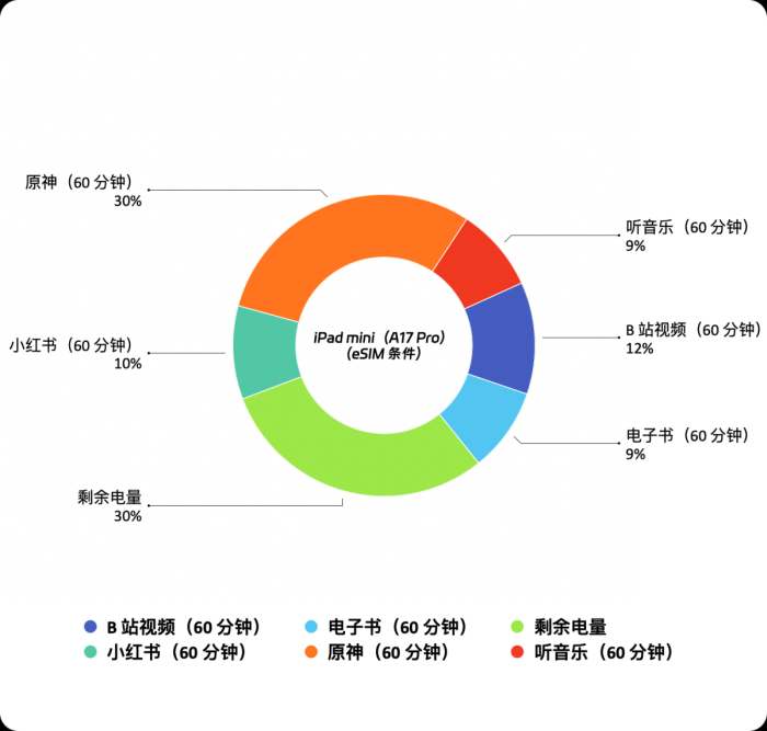 在电池方面,iPad mini(A17 Pro)搭载了一块 19.3Wh 电池,支持通过 PD 协议 进行最高 20W 功率充电。根据苹果官网信息,在 WiFi 条件下,这款 iPad 可以连续播放约 10小时。为了进一步了解其续航表现,进行了以下测试,在 WiFi 条件下,进行 1小时在线视频、1小时小红书、1小时听音乐、1小时原神和1小时阅读电子书的使用后,测试结果如下: