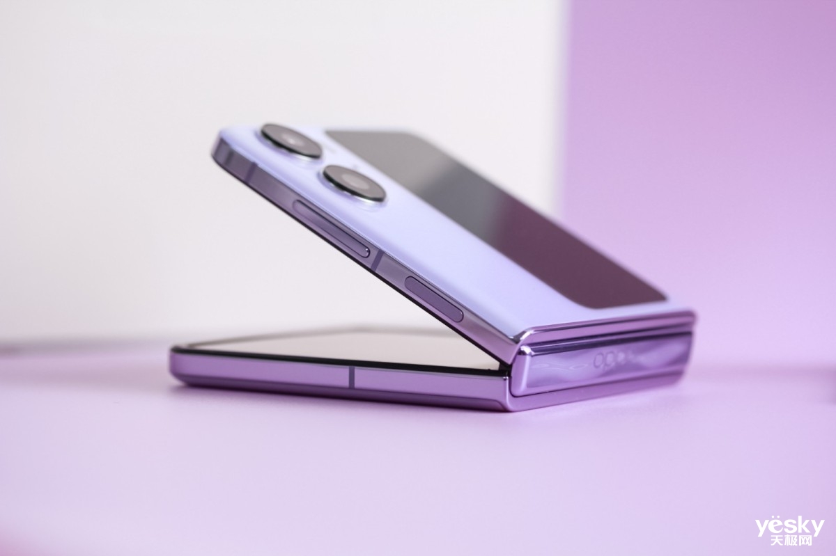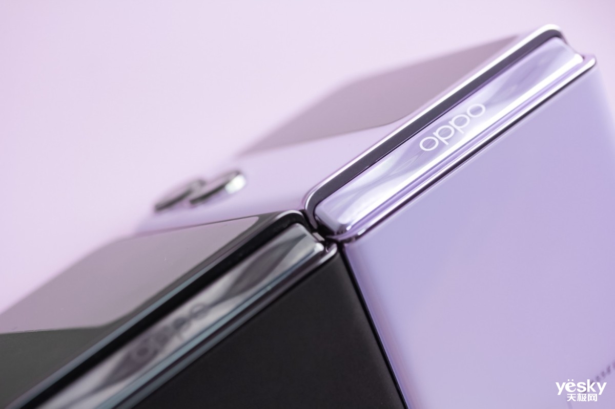 外观设计上,OPPO Find N2 Flip提供流金、慕紫、雅黑共三款简约配色。流金配色通过五轴机立体加工,形成独特的立体光影感呈现晶莹剔透的视觉效果。慕紫配色通过高亮玻璃和AG雾化膜片的结合,呈现出一种既通透又有光影的纹理效果,低饱和度的淡紫色显得更温柔浪漫。雅黑配色则通过激光雕刻工艺与OPPO Glow闪光砂工艺叠加,呈现出若隐若现的细腻流光纹理,一集如针织缎面般顺滑的触感。