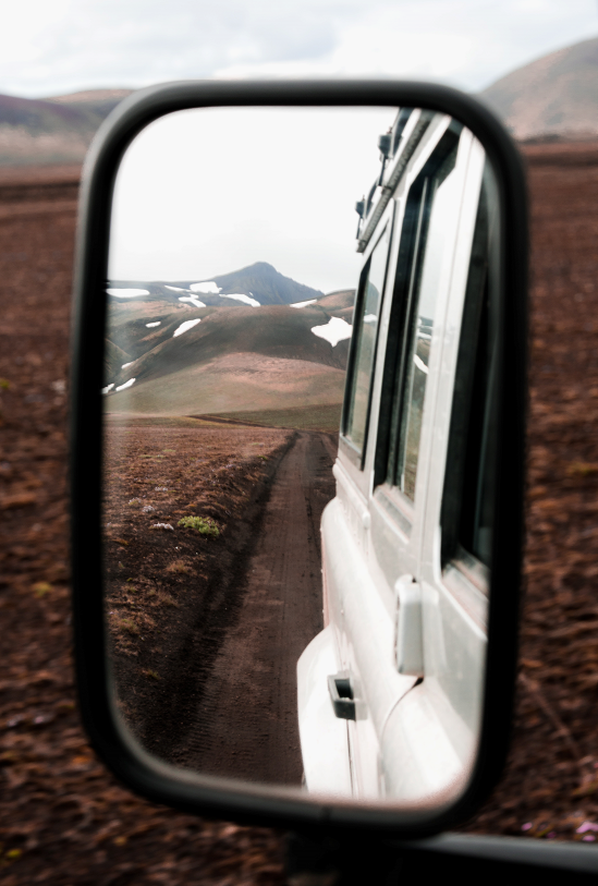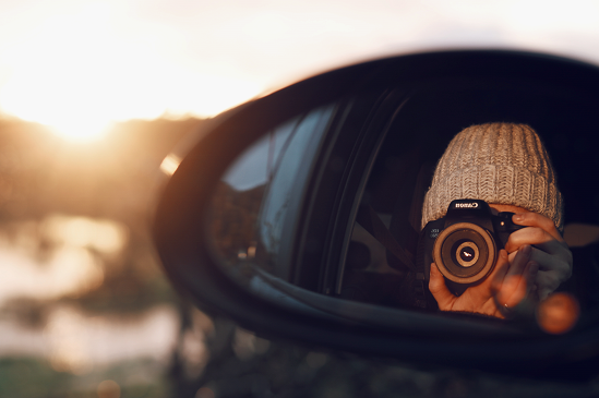 刚才我们说的是角度,但实际上利用镜面摄影并非只局限于水面倒影,我们可以跳出反射物体的框架,可以利用车后视镜、车窗、商业街橱窗、交通镜、眼镜甚至瞳孔进行一系列的镜面摄影创作,找到属于画面中有秩序有美感的东西就可以了。甚至直接上镜子,类似出现草地+天空、梳妆台+妆容等有事物连接性的元素,可以丰富整个画面的空间感。