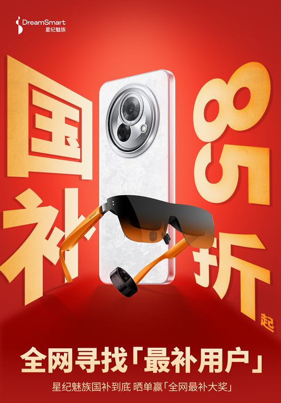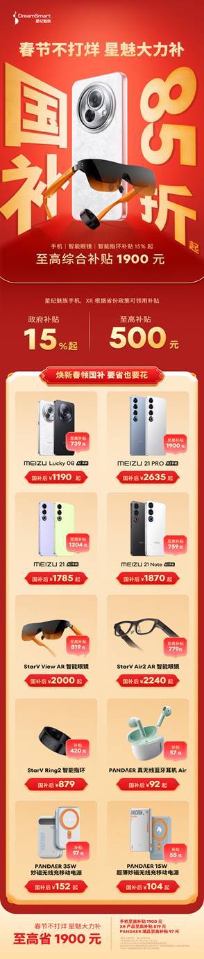 首先,划重点!此次星纪魅族旗下系列产品——魅族 AI 手机、AR 智能眼镜 StarV View、StarV Air2、智能指环 StarV Ring2 以及PANDAER 潮品不但有国补,还叠加了魅族年货节优惠和晒单赢全网最补大奖活动,BUFF叠满!其中,手机至高补贴 1900 元; StarV View 至高补贴 819 元;StarV Air2至高补贴779 元;StarV Ring2