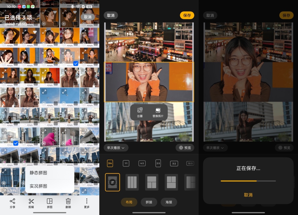 步骤也非常简单,第一步,选择多张拍摄好的实况素材;第二步,点击底部“拼图”按钮,挑选心仪模板并放大需要突出的主体;第三步,保存生成,一张自带故事感的出圈拼图就完成了!选择素材时,建议按照前景-中景-后景的层次来构图;而“出圈”主体最好选肢体动作夸张、表情张力强的照片,效果会更惊艳。