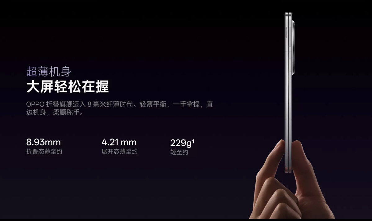 作为全球首款厚度突破9mm的折叠旗舰,OPPO Find N5折叠状态仅8.93mm的机身比iPhone 15 Pro Max还要纤薄,展开后4.21mm的单边厚度更是接近Type-C接口极限。这种”合上是旗舰机,展开是平板"的设计,让商务人士终于能把折叠屏轻松塞进西装内袋。