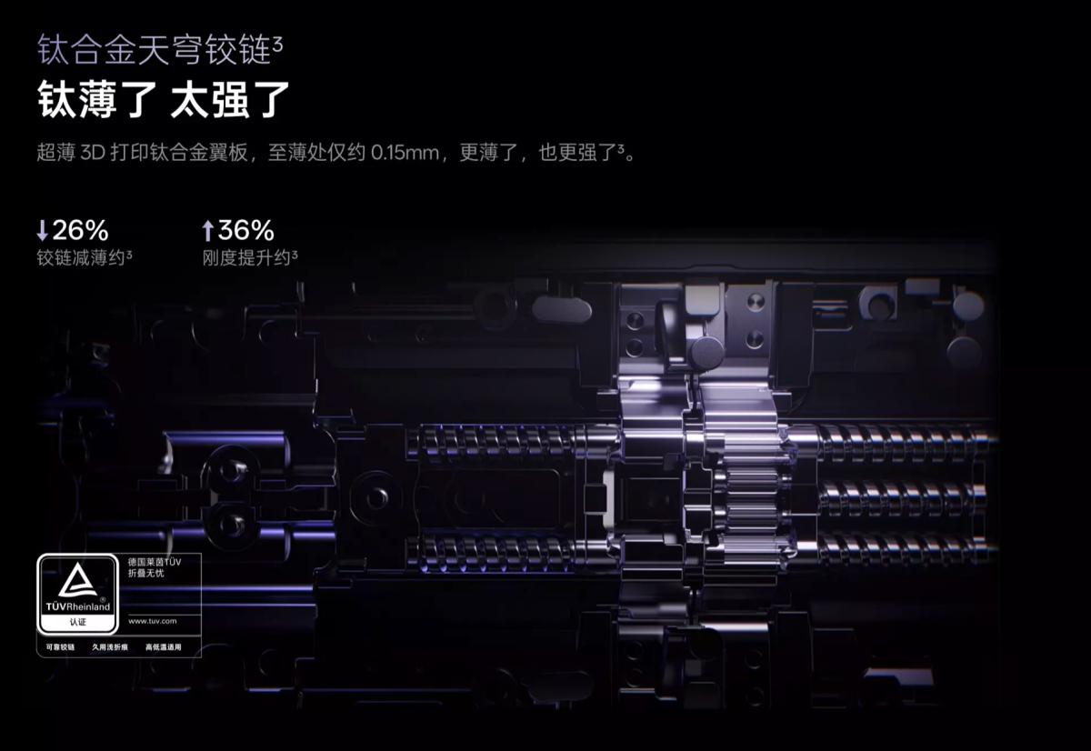 实现这一突破的核心是OPPO自研的钛合金天穹铰链——通过3D打印技术将航空级钛合金熔铸成0.15mm超薄翼板,配合2200MPa超强钢基座,铰链整体减薄26%的同时刚度提升36%。德国莱茵实验室实测显示,经过14天连续折叠后,屏幕折痕深度仍小于0.15mm,成为全球唯一通过”无感折痕认证"的折叠屏手机。