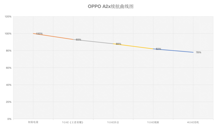 续航方面,OPPO A2×内置了一块 5000mAh超级大电池,并且根据OPPO官方实验室的测试数据,循环四年依旧有80%以上电池容量保持率。在小编的实际测试中,百分之电量情况下,打一个小时王者荣耀剩余电量百分之93,一小时抖音剩余电量百分之88,一小时视频剩余电量百分之82,4小时待机剩余电量百分之78。